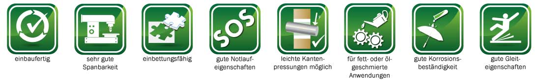 Bundlager aus Mehrstoff-Zinnbronze optional mit Schmierlöchern und/oder Schmiernuteneinbaufertigsehr gute Spanbarkeituniverseller Gleitlagerwerkstoffgute NotlaufeigenschaftenDIN 3547 / ersetzt DIN 1494für fett- oder ölgeschmierte Anwendungengute Korrosionsbeständigkeit, auch im MeerwasserTechnische InformationenZugfestigkeit Rm: min. 230 N/mm²Dehngrenze Rp0,2: min. 120 N/mm²Bruchdehnung A: min. 12 %Härte: min. 60 HBörtlicher maximaler Flächendruck: 60 N/mm²Reibungskoeffizient: je nach Anwendung 0,08 bis 0,20max. Gleitgeschwindigkeit: anwendungsabhängigTemperaturbereich: schmierstoffabhängigWärmeausdehnungskoeffizient (bei 20 °C): 18 x 10-6 K-1Wärmeleitfähigkeit (bei 20 °C): 64 W/(mK)Externer Link zum DatenblattZum Kontaktformular