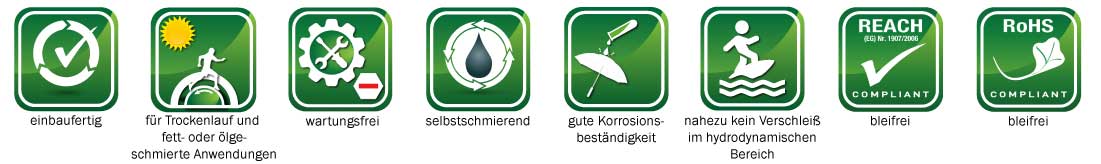 Reibungskoeffizienzt (geschmiert): 0,02 bis 0,07 - max. Gleitgeschwindigkeit (trocken): 2,5 m/s